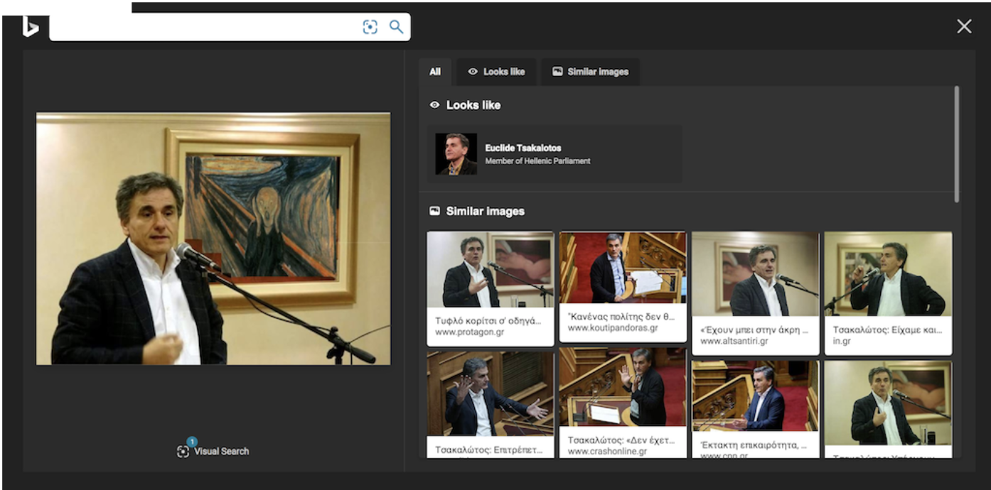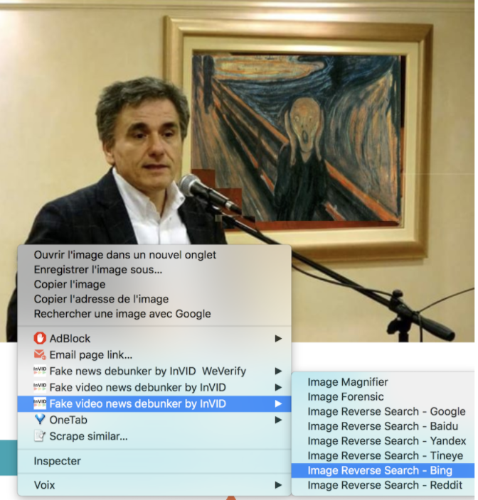 Vous avez téléchargé l'extension InVID-WeVerify, (voir aspects techniques ci-dessous) allez dans l'onglet "Interactif". Vous avez plusieurs propositions d'images et de vidéos. Nous allons nous concentrer sur la première image proposée qui est celle du ministre grec de l'Economie, Euclide Tsakalotos, parlant devant le tableau "Le Cri" du peintre norvégien Edvard Munch. Cette image est une parodie : Tsakalotos a été ridiculisé pour avoir parlé devant un portrait de femme nue peint par Modigliani.
