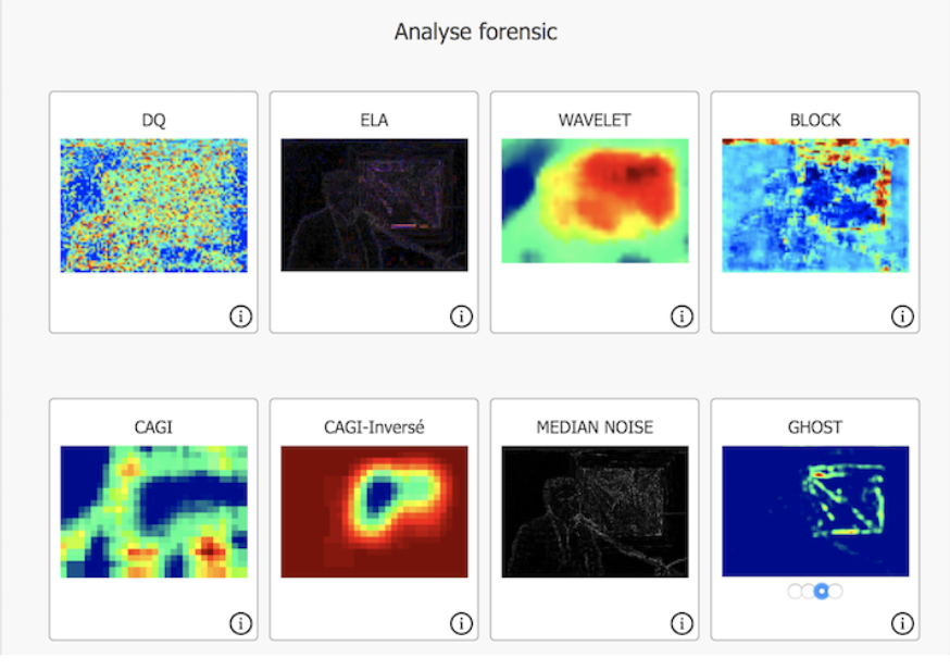 Revenez ensuite à l’image détournée et cliquez sur "la recherche Forensic" sous l’image. En faisant défiler la page vers le bas, vous pourrez voir comment une image peut être analysée avec des outils numériques. Le filtre numéro 3 montre bien que c'est la peinture qui a été détournée.