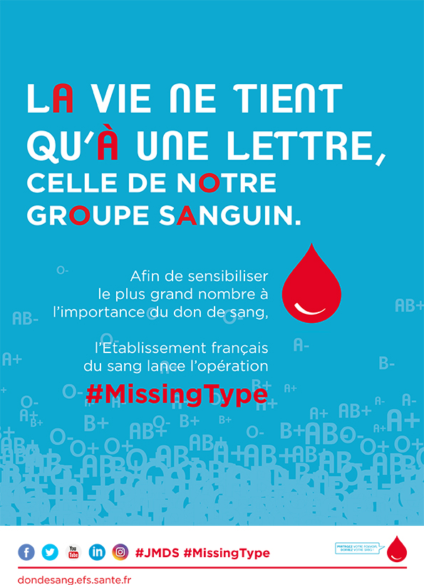 Sensible à cette cause qui rejoint les valeurs de notre entreprise, nous avons choisi de nous emparer de #MissingType lancée pour sensibiliser à l’importance des groupes sanguins et bien au-delà, au don de sang.