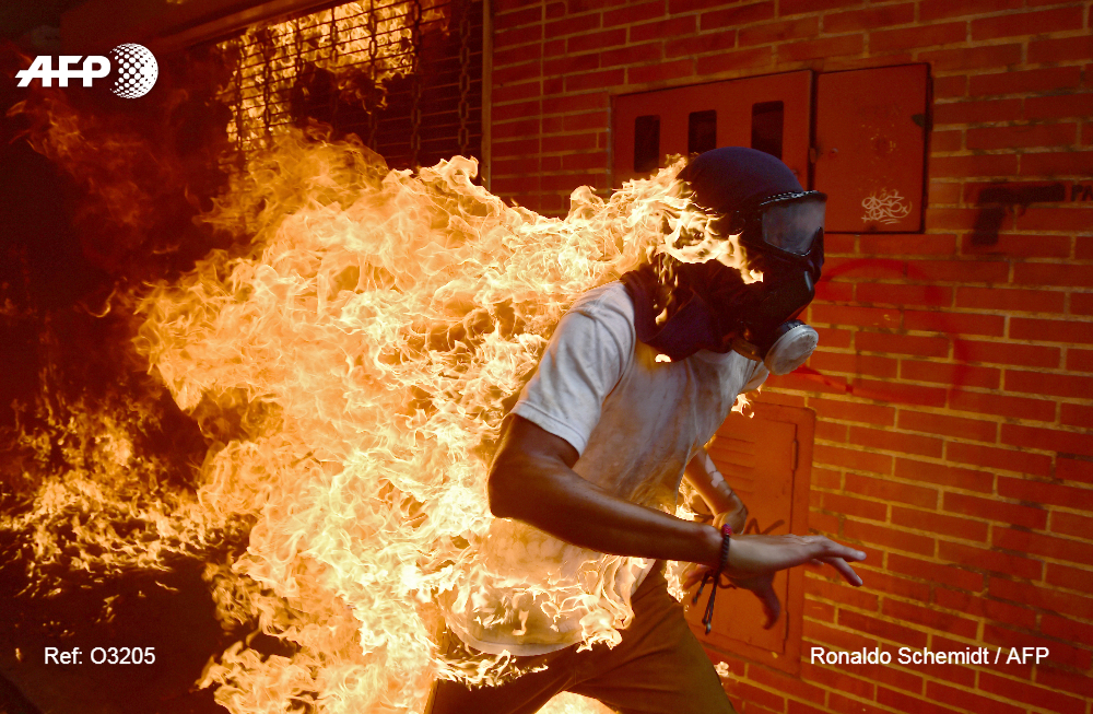 Le cliché de Ronaldo Schemidt d’un manifestant en feu pris lors des affrontements avec les forces de l’ordre au Venezuela fait partie des 6 meilleures photos de l’année retenues par le jury. Il est également nommé pour la même image dans la catégorie « Spot Singles ». Vénézuélien, Ronaldo Schemidt entame sa collaboration avec l’AFP en 2004 avant de rejoindre le bureau de Mexico en 2006 où il est désormais en poste. Il a participé à nombre de couvertures dont la Copa America en Argentine, la Coupe du monde de football au Brésil et la lutte contre les narcotrafiquants au Mexique.