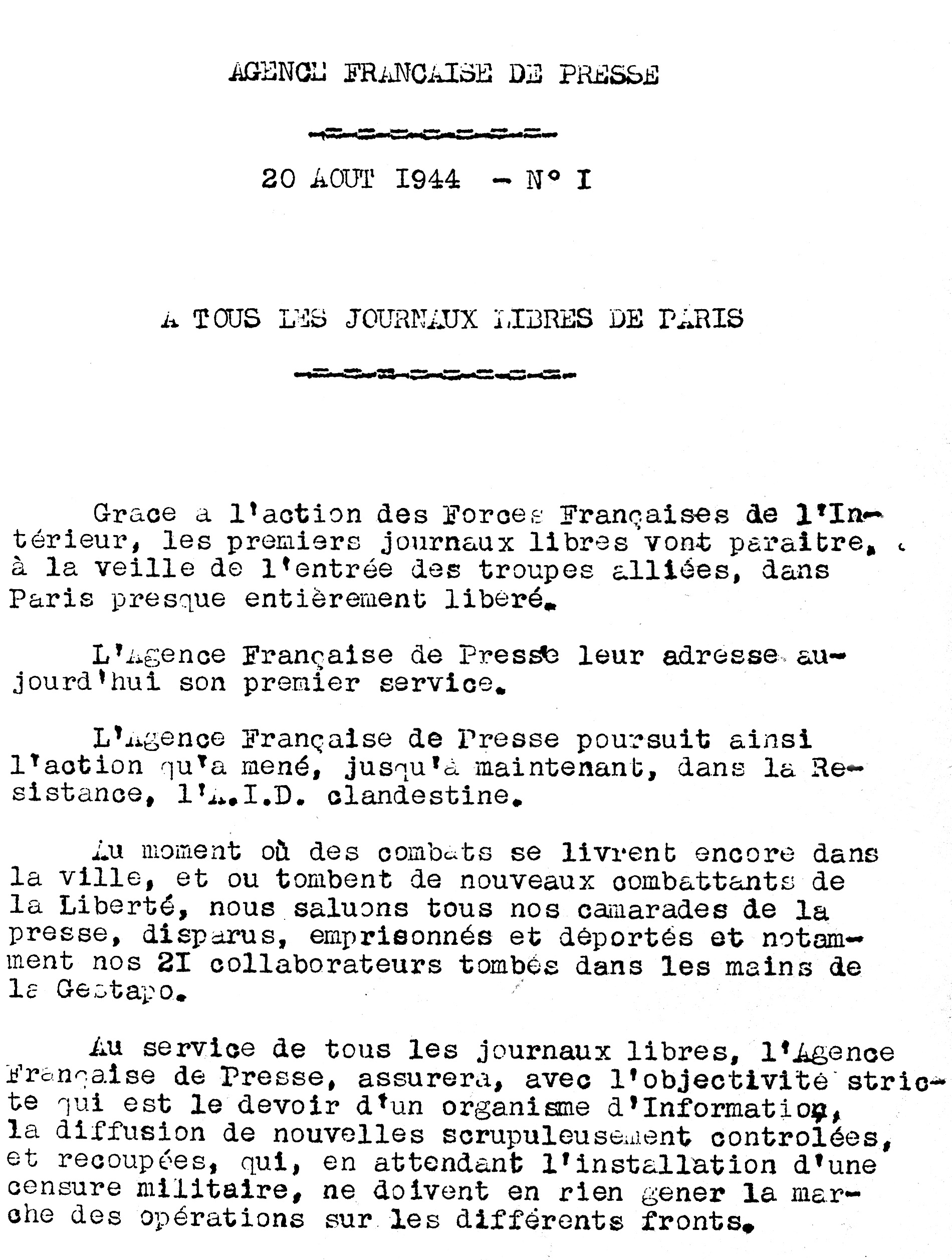 Au service de tous les journaux libres, l'Agence Française de Presse assurera, avec l'objectivité stricte qui est le devoir d'un organisme d'Information, la diffusion de nouvelles scrupuleusement contrôlées et recoupées qui, en attendant l'installation d'une censure militaire, ne doivent en rien gêner la marche des opérations sur les différents fronts".